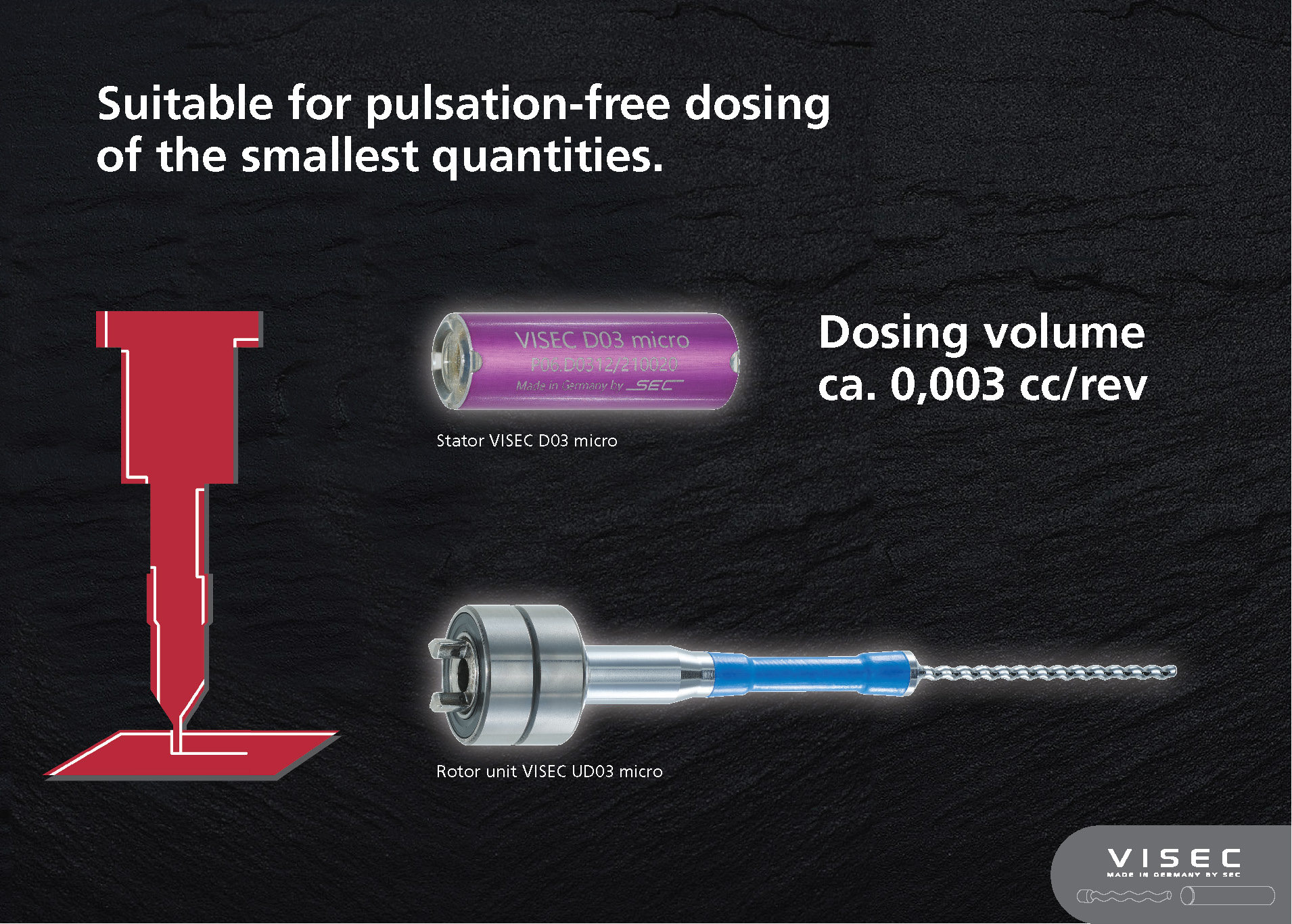In combination with the perfectly matched rotor unit "VISEC UD15 micro", constant and precise dosing is possible. The thin and highly resistant elastomer compound "hi-tec" from SEC also provides optimum protection for this rotor unit, while at the same time ensuring flexibility of the rotor shaft.